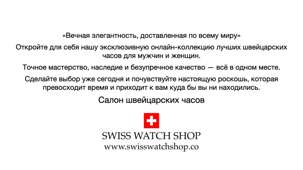 О нашей коллекции Мы предлагаем исключительно подлинные часы с маркировкой «Swiss Made» от производителей, официально зарегистрированных в Федерации швейцарской часовой промышленности. На все наши часы распространяется международная гарантия сроком на 3 года.