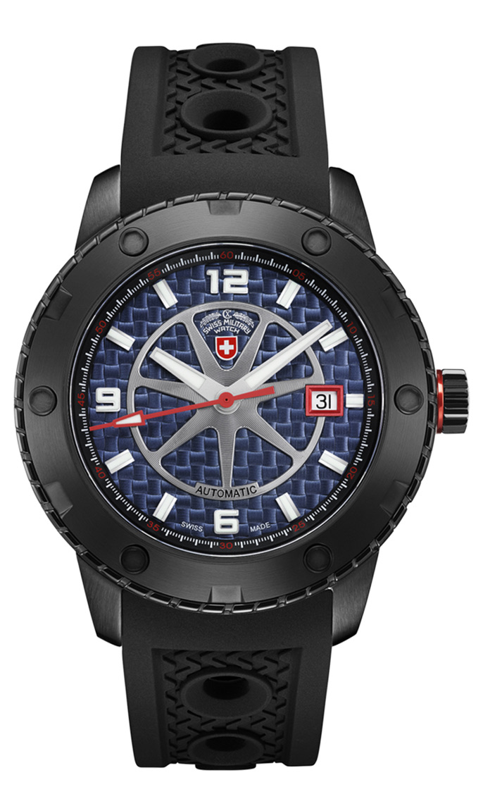The RALLYE AUTO sets a new standard in its class of motorsports watches: the design of the complete case was inspired by the heavy duty wheels used in rallye motorsports and the ETA cal. 2824 Swiss Made automatic movement is as trustworthy as any V8 engine. The sapphire crystal protects an intricately designed dial that resembles the spokes of a wheel. The RALLYE AUTO is water resistant to 200 meters and is available in five dial colors – silver, black, blue, Monza red and Dakar yellow (all with professional grade luminous Superluminova™ indices)